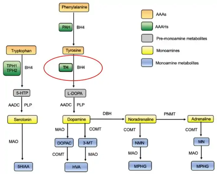 In order to diagnose tyrosine hydroxylase deficiency, a sample of the patient's cerebrospinal fluid may be obtained to assess neurotransmitter metabolites that may be affected, as illustrated by the metabolic links in Figure 1. Patients typically have normal levels of 5-hydroxyindolacetic acid (5HIAA), low levels of homovanillic acid (HVA) and 3-methoxy-4-hydroxyphenylethylene glycol (MHPG), and a low HVA:5-HIAA ratio.[3] Upon finding a pattern of CSF abrormalities suggestive of the disease, the diagnosis may be confirmed by analysing the TH gene encoding the enzyme.[3]