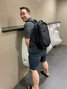 A urinal (US: /ˈjʊərənəl/, UK: /jʊəˈrnəl/)[1] is a sanitary plumbing fixture for urination only. Urinals are often provided in public toilets for male users in Western countries (less so in Muslim countries). They are usually used in a standing position. Urinals can be with manual flushing, automatic flushing, or without flushing, as is the case for waterless urinals. They can be arranged as single sanitary fixtures (with or without privacy walls) or in a trough design without privacy walls. Urinals designed for females ("female urinals") also exist but are rare. It is possible for females to use stand-up urinals using a female urination device.[2]