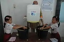 Supervised daily group handwashing in schools can be an effective strategy for building good hygiene habits, with the potential to lead to positive health and education outcomes for children.[53] This has for example been implemented in the "Essential Health Care Program" by the Department of Education in the Philippines.[54] Deworming twice a year, supplemented by washing hands daily with soap and brushing teeth daily with fluoride, is at the core of this national program. It has also been successfully implemented in Indonesia.[55][56]