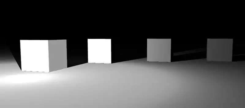 The closest box is much brighter than the second closest box, but because the brightest color on a monitor is white, the effects cannot be seen. The second box is actually set at the Fall-Off distance and all other boxes are set farther away then that.