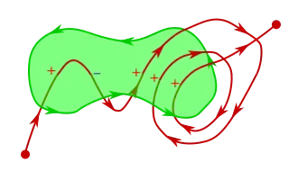 ![]() A 3D image showing the intersection of a simple path (red curve) with a simple surface (green surface with the counter-clockwise boundary highlighted). The positive intersection points are denoted by red "+" signs, and the negative intersection points are denoted by blue "-" signs. |