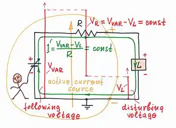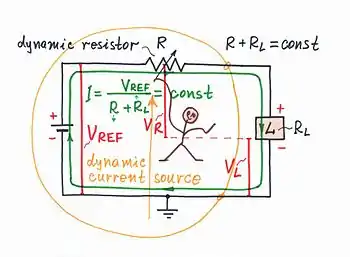 If we look around, we can see that most things in this world are changeable, adaptable, dynamic... According to this observation, we have to make our current source react somehow to the load "intervention", to resist to its attempt to lower the current. That means something inside the current source has to change, in order to compensate the disturbing voltage drop across the load. What can change in this simple electric circuit?