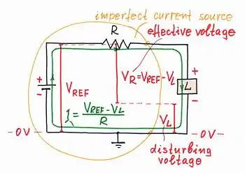 ...in terms of voltage. The real load introduces some voltage drop VL, which affects the excitation voltage VIN. Now, not all the input voltage is applied across the current-setting resistor R but only the voltage difference VIN - VL. In other words, here the voltage difference VIN - VL determines the current IOUT instead the voltage VIN. As a result, the current decreases: IOUT = (VIN - VL)/R.