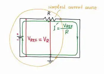 How do we make the most simple current source? As we all know, thanks to a certain wise man called Ohm, the only way to get yourself some current is to apply some voltage over some resistance. The easiest way to achieve this is to connect a voltage source in series with a resistor.