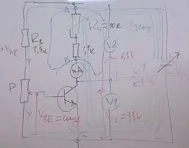 Then there are our watchful eyes - the voltmeter V2, used to keep an eye on the voltage drop on the load resistor (the boss), another voltmeter V1, watching over the voltage drop on the transistor's collector-emitter junction, and an ammeter, which gives us a sneak-peak on the current flow.