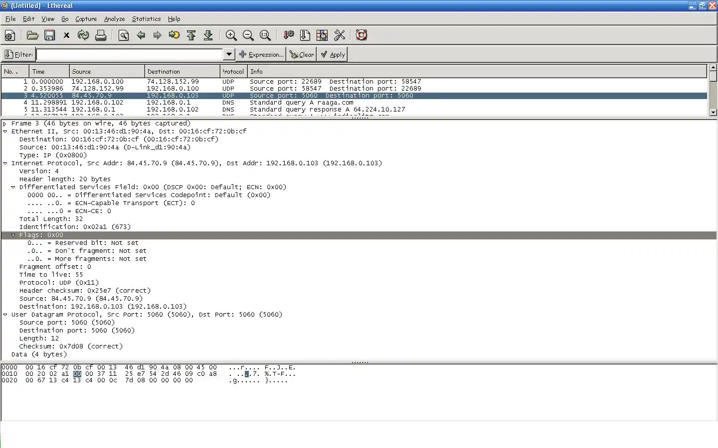 The UDP packet can be viewed using Ethereal capture. One such UDP packet is captured and shown below.