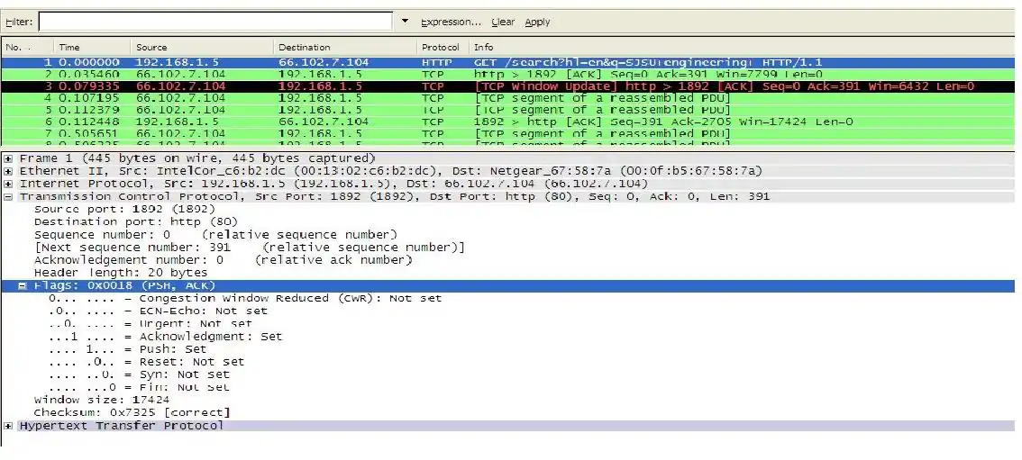 The TCP packet can be viewed using Ethereal capture. One such TCP packet is captured and shown below. See that the ACK-flag and PUSH-flag are set to '1' in it.