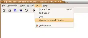 For uploading the latest firmware (or other programs) on the real e-puck, select the menu Tool | Upload to e-puck robot... as depicted in the figure. Then, a message box asks you to choose which Bluetooth connection you want to use. Select the connection which is linked to the e-puck and click on the Ok button. The orange LED on the e-puck will switch on. Then, a new message box asks you to choose which file you want to upload. Select the following file and click on the Ok button: