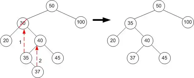 4. 35 replaces 30, at the original right node, and the node with 35 is deleted, replacing it with the right sub-tree, which has the root node 37.