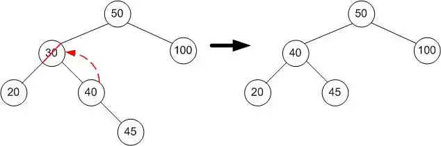 2. delete the successor node (contents 40), replacing it with its right subtree (head contents 45).