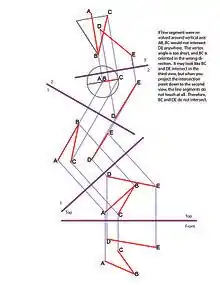 If the axes of the cones are not segments, but infinitely long lines, it is necessary to test if there are more two solutions. The rotating line that creates the conic surface can point in different directions from the vertex, creating a possibility of two cones. Because of this, there can be a maximum of four loci intersections for four cones.
