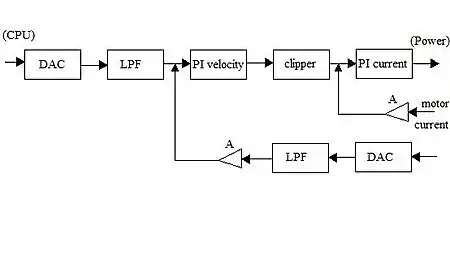The conceptual scheme of figure 7 thus consists of Digital to Analog Converters (DAC1 and DAC2), low pass filters (LPF), PI-controllers (PI vel and PI curr), amplifiers (A) and a clipper. These elements can be realized with a collection of resistors, capacities and other simple electronic components.