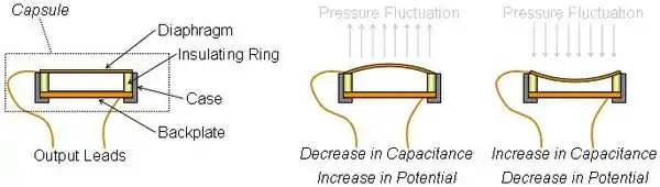 The capacitor in a condenser microphone consists of two parts: the diaphragm and the backplate. The diaphragm moves due to impinging pressure fluctuations and the backplate is held in a stationary position. When the diaphragm moves closer to the backplate, the capacitance increases and a change in electric potential is produced. The diaphragm is typically made of metallic coated Mylar. The assembly that houses both the backplate and the diaphragm is commonly referred to as a capsule.