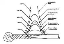 So solid phase pyrolysis refers to the generation of fuel vapor at a solid or liquid surface, while the visible flames are not due to combustion of the solid fuel itself, but rather of the gases released by its pyrolysis.