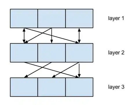 In the figure each layer relies on the layer below it to function and provides services to the layer above it. For example, a unit in layer one is only allowed to call units in layer 2 below it. All interactions are limited to pairs of layers that are next to each other in a stack of layers. We could replace a layer completely with a new implementation without affecting the rest of the stack, which achieves modularity. On the contrary if any arbitrary interaction is allowed we may end up with tightly coupled system as shown in the following figure.