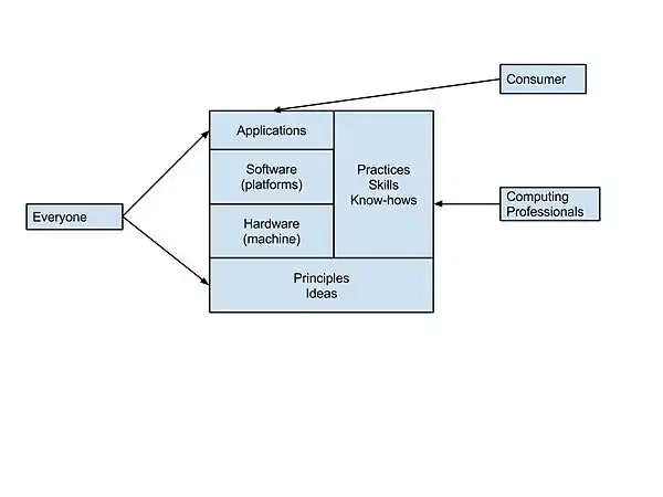 The chart to the right illustrates the difference between principles of computing and practices of computing. Principles underly technologies and practices. A consumer exploits the power of computing through the applications built for them for various tasks. We believe everyone needs to know the principles of computing because such principles are widely applicable. As professionals in the field of computing we need to know the two ends and everything in the middle - the practices (activities and skills that make computing useful and effective).