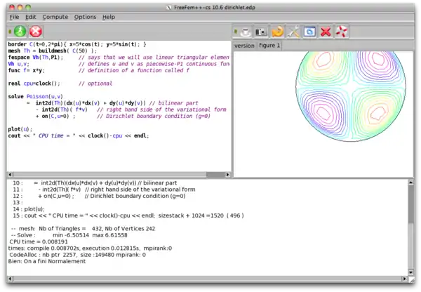 The automatic triangulation, the finite element solver and the graphics are integrated in freefem and driven by a freefem script.