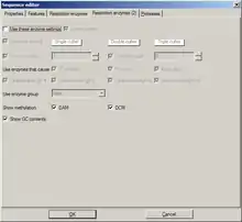 When editing a DNA sequence, two tabs with settings for restriction enzymes are available. The first one is identical to the enzyme management dialog. The second one is identical to the global enzyme settings tab, but contains the settings for this sequence alone. By default, its options are disabled, and the global options are used. By activation the options here, global settings are overridden.