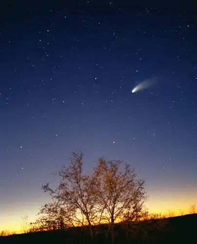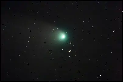 Comet C/2001 Q4 NEAT was discovered in August 2001 in the course of the Near Earth Asteroid Tracking (NEAT) program. The comet was found on Charged Coupled Device (CCD) images and the astronomers were able to confirm the discovery on August 24. The comet was described as a round nebulosity measuring about 8 arc seconds across at the distance of 10.1 AU from the Sun. The total visual magnitude was 20.0. Its perihelion date was 2004 May 26 and perihelion distance was 1.00 AU. It has an unusual, almost perpendicular retrograde orbit which brings it into the inner solar system by a deeply southward path. It initially emerged from its remote home where it spent most of its time near the south celestial pole.[3] The comet brightened slowly during the remainder of 2001 and throughout 2002. It appeared fainter than magnitude 15 at the beginning of the 2003, but it steadily brightened as the year progressed, to magnitude 12 around mid-September. In September amateur astronomers could easily mark the time of comet in the Southern Hemisphere began supplying regular visual observations of this comet, at which time the diameter of the coma was typically measured as 0.6 to 1.2 arc minutes. In CCD images amateurs began observing a short fan-shaped tail pointing northward in July as on its approached to the Sun. In late September, the tail extended about 0.8 arc minutes toward the northwest. As 2003 came to an end, the comet became slightly brighter than magnitude 10, with a coma diameter of about 2 arc minutes. A faint, fan-shaped tail extended about 4 arc minutes toward the east. Finally, Comet C/2001 Q4 (NEAT) entered the inner solar system in 2004, reaching perihelion of 1 AU. It's peak magnitude of 3.3 rendered it clearly visible to the naked eye. C/2001 Q4 is referred to as an Oort cloud comet as it originated from Oort cloud. It is composed of HCN, CO, CH3OH, H2S and other species.[4]