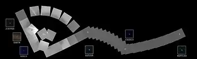 This mosaic image of the Sun and six planets was taken by the Voyager spacecraft from beyond the planets. Earth is barely visible as a blue dot in one of the frames, almost lost in the glare from sunlight. The Voyager spacecraft, which view the orbits of the planets from outside, are the most distant man-made objects from Earth. Notice that the two terrestrial planets, Venus and Earth, are much nearer the Sun than the others.