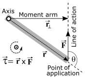 Torque is the action of a force on a mass which induces it to revolve about some point, called the origin. It is defined as