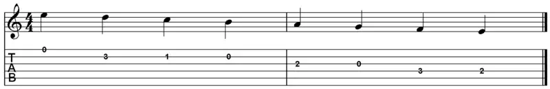 A descending one octave Phrygian mode starting from the note "E" which can be played over the above chord progression.