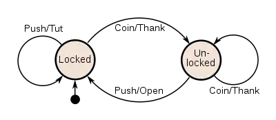 The turnstile has two states: Locked and Unlocked. (It starts in a Locked state). There are two types of input: Coin (corresponding to someone putting a coin in the slot) and Push (corresponding to someone pushing the arm). Each input causes an output (Thank, Open or Tut) and a transition to a (new, or maybe the same) state. If someone puts a coin in when the turnstile is locked, they are thanked (yes, it can talk!) and the turnstile becomes unlocked. If they add more coins, they are thanked more but get no benefit (the turnstile simply remains unlocked with no memory of how many additional coins have been added). If someone pushes the arm when the turnstile is unlocked, the arm will open to let them through, then become locked to prevent anyone else going through. If someone pushes the arm when the turnstile is locked, it will politely tut at them but not let them through and remain locked.