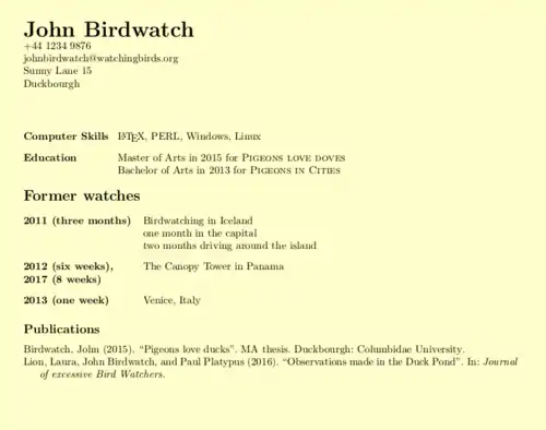 A curriculum vitæ or résumé has a universal requirement: its formatting must be flawless. This is a great example of cases where the power of LaTeX comes to the front. Thanks to its strong typographical stance, LaTeX is definitely a document processor of choice to write a CV.