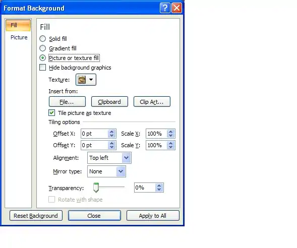 - Click on APPLY TO ALL to apply the picture to all slides in the presentation