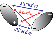Two molecules that possess permanent dipole moments have a dipole-dipole interaction. Attractive interactions occur between the opposite-sign poles of the molecules (+/-). Repulsive interactions occur between the like-sign poles (+/+ and -/-).