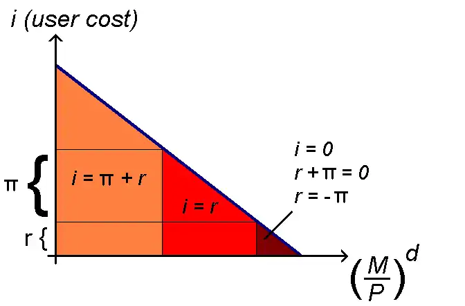 In the graphic to the right the utility is depicted by the area below the graph. The lower i gets, the bigger the area becomes. With i = r the sum of both areas, the orange and the red one, indicates the total utility of liquidity preference. The area gets larger as i decreases and because the user cost decreases people are more likely to keep cash than to deposit it. As a consequence more cash is in circulation, money increasingly serves as the medium of exchange. What the graphic also shows is the theoretically optimal rate of inflation:
