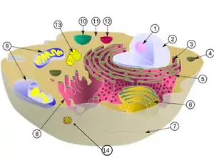 A cell with a virus (virus labelled 14)