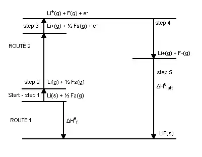 As lattice enthalpy cannot be measured, another way of working out lattice enthalpy values is needed. To do this we must show the complete pathway for the reaction, including lattice enthalpy (Route 2 below) and compare this to the enthalpy change of formation (Route 1). We can do this because Hess's law states: