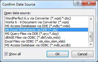 - When you are prompted for the data source, click 'Show All', and select 'MS Excel Worksheets via DDE (*.xls)'. DDE prevents accuracy issues with floating point numbers, where numbers such as 1.99 are displayed as 1.989999999 on merge.