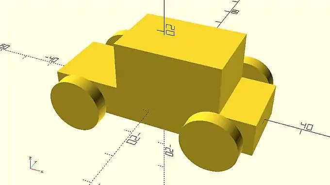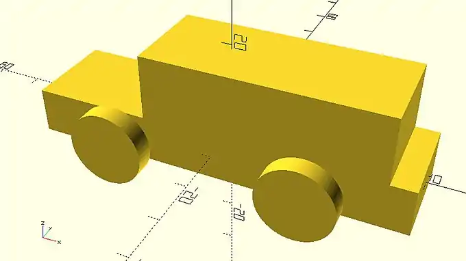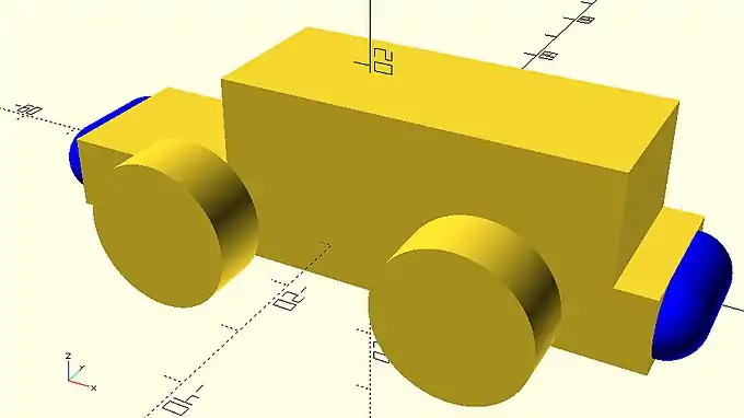 Given the following script that creates a car, make appropriate additions and modifications to the script in order to parameterize conditionally the design of the car. Specifically, you will need to define a body_version, a wheels_version, a top, a front_bumper and a rear_bumper variable that will be used for making design choices regarding the car’s design. If necessary, review the previous examples and exercises of this chapter to remember what effect these variables should have on the design of the car and how to implement them. Use the resulting script to create a version of the car that you like.