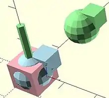 color("blue") { translate([5,3,0]) sphere(5); rotate([45,0,45]) { cylinder(10); cube([5,6,7]); } }
