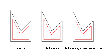 - Fillet: offset(r=-3) offset(delta=+3) rounds all inside (concave) corners, and leaves flat walls unchanged. However, holes less than 2*r in diameter vanish.