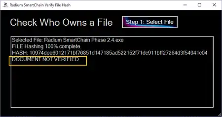 3b.) Upon locating the file, select "Open" on the file explorer window, and you will see this output if the file does not match any published file checksums on the SmartChain.