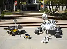 Mars Science Laboratory mockup (right) compared with the Mars Exploration Rover (left) and Sojourner rover (center)