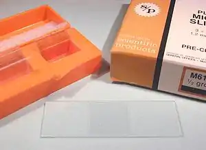 A microscope slide is a thin sheet of glass used to hold objects for examination under a microscope. A standard microscope slide (shown on the right) is 75 x 25 mm (3" X 1") and 1.2 mm thick. A range of other sizes is available for various special purposes.