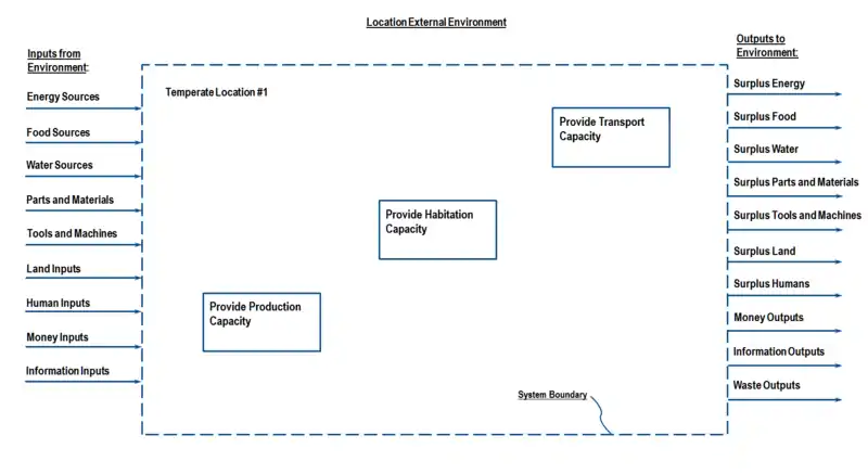 For this analysis we consider the location as a whole as the system, and draw a boundary around it to separate it from the outside environment (Figure 5.3-1). Input and output flows that cross the system boundary come from the physical environment and the remainder of human civilization, which includes technology developed in Phase 0. Within this system boundary, we have previously identified three top level functions of production, habitation, and transport. There may be other functions at this level not identified yet. We do not show the flows between the functions or to and from the system boundary because that would make the diagram too complicated. Instead we use a spreadsheet which tabulates each flow and box on the diagram as rows, and the various resources that make up that item as columns. The Input-Output Model on our Desktop Space Program project on Sourceforge is a generic version of such a spreadsheet, and the Temperate Location Model is the particular one being developed for this study. The design must meet the rule that total flows and functions sum to zero, where outputs have positive values and inputs have negative values. Otherwise something is appearing or vanishing without explanation. Enforcing this rule ensures that all necessary items are identified and accounted for.