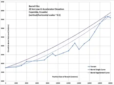 The geography of Ecuador is not a smooth slope like Hawaii. We assume the barrel is 20.25 km long, but curved upward with a segmented radius that keeps centrifugal acceleration at or below 12 m/s^2. That will be felt by passengers as a vertical acceleration (head to toe). The barrel will need to be supported on towers or use tunnels as needed to fit the terrain, and the curvature roughly fits the geography, which is flat initially, rising to a mountain at the end. The ends are at 2778 m elevation south west of the town, and 5731 m at the top of the mountain, with initial and final slopes of 1.4 and 12.4 degrees caused by the curved barrel The gentle curvature keeps the vertical acceleration low relative to the forward acceleration. The higher slope at the muzzle end also allows faster climb through the atmosphere and less drag loss. These assumptions may be changed with more detailed analysis. We assume the rocket stage is 4 x 32 meters in size, and closely fits the barrel, with a mass of 400 tons at launch.