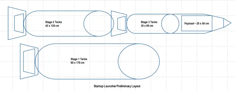 • Rocket stage tanks can share a common wall between fuel and oxidizer if they are fully sealed, and usually use an ellipsoidal dome with a 70% height ratio to minimize structural mass. We assume the payload has a density of 1 kg/liter, and thus requires 20 liters volume. For aerodynamic and structural reasons we want to keep the total vehicle height at 10 times the base diameter or less. Each combined stage tank can be modeled as two ellipsoidal domes plus a cylinder. Applying some geometry results in tank diameters of 60, 42, and 30 cm.