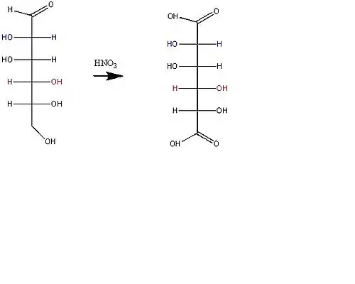 By adding the HNO¬¬3 to arabinose, arabinose will be oxidized into an optically active aldaric acid. Out of the four possible aldaric acid derivatives from a set R penultimate configuration, two were eliminated because they were not optically active. The two remaining candidates’ C2 have the same S stereocenter configuration.
