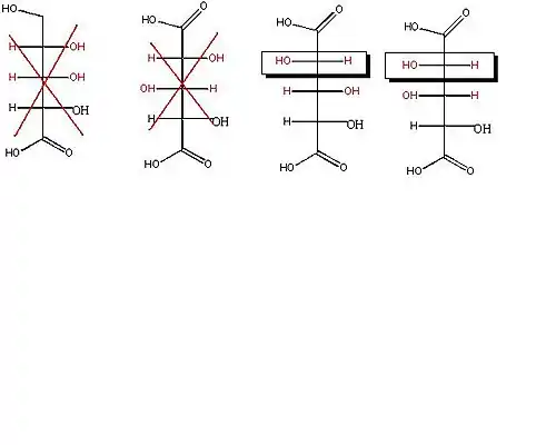 Next, mannose and glucose were oxidized by HNO3. Mannaric acid and glucaric acid were also optically active. With only one unknown stereocenter, there are two possible forms of aldaric acid for each sugar. Out of the four total predictions of glucose and mannose, one of the aldaric acids is meson and therefore cannot be either Mannaric or glucaric acid. Mannaric acid and glucaric acid should have the same stereocenters except for the inverted C2 stereocenter. When one of the models below was rejected, the other model whose C4 is in an S configuration was also rejected. Below, the two circled aldaric acids are mannaric acid and glucaric acid.