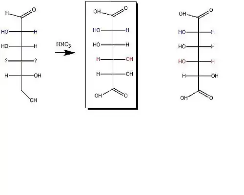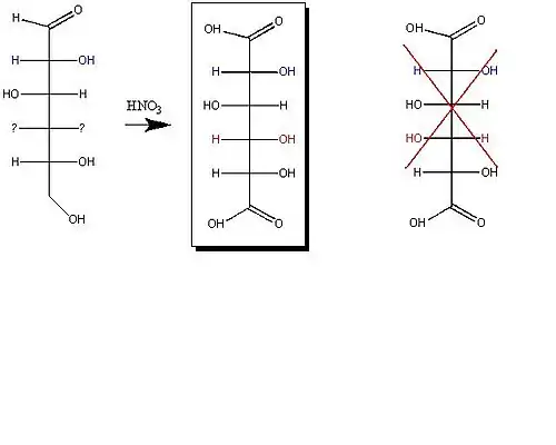 The last part of the Fischer proof was to figure out which one is actually glucose. The last clue to Fischer’s proof was that, while glucaric acid can be derived from two sugars, mannaric acid can only be derived from the oxidation of mannose, because mannaric acid is rotationally symmetrical.