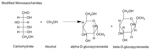 Ring Structure of Monosaccharides After hemiacetals and hemiketals form, the carbohydrate will form a ring structure. For example, in Glucose the Hydroxyl group from the Carbon 6 will attack the carbonyl Carbon from Carbon 1, with a hemiacetal intermediate. The Carbon that will then change from a carbonyl carbon to a carbon with a hydroxy will then be called an anomeric carbon. An anomeric carbon is the hemiacetal or hemiketal that is bounded by an alcohol group and an ester bond. Anomers are another form of isomers that differ in the hemiacetals or hemiketals.The most common structure of a glucose ring is the alpha conformation in contrast with the sterically hindered Beta conformation. The alpha conformation is structure in which the hydroxyl in Carbon 1 is facing the opposite of the plane as carbon 6, while the beta conformation is facing in the same plane as the Carbon 6 thus causing steric hinderence. For this reason of steric hinderance the alpha conformation is much more stable than beta.