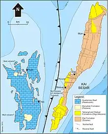 There are limited publication related to the geology of Kai Kecil (Small Kai). Pertamina-BEICIP map (1982) shows that Kai Kecil island complex is dominated by Quarternary reefs. Pliocene Weryahan Fm occur in isolated places as olistostrome, which probably generated by mud volcanoes. The Kai Kecil is separated from Kai Besar by a significant thrust fault dipping to the west.