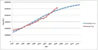 The data used for the quantitative analysis portion was collected by Dr.William W. Wilson, a professor for the Department of Agribusiness and Applied Economics at North Dakota State University.[10] From the 1990 to 2006, the total United States port container throughput was recorded in units of TEU (twenty-foot equivalent unit). The data has been used to estimate a three-parameter logistic function: