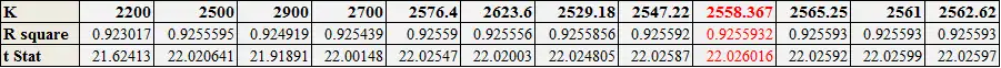 Before using the “Golden Section Search”, four initial K values of 2,200, 2,500, 2,700 and 2,900 are tested. The results show that values of 2,500 and 2,700 are better than of 2,200 and 2,900, based on the strength of the R-square and t-stat numbers. So, the best value of K must lie in the interval [2,500, 2,700].